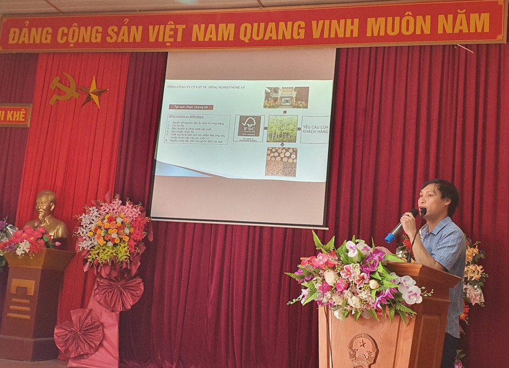 Đợt truyền thông lần này nhằm kêu gọi các hộ trồng rừng quy mô nhỏ ở huyện Con Cuông đăng ký tham gia chứng chỉ rừng quốc tế, giúp xây dựng vùng nguồn nguyên liệu cho việc xuất khẩu viên nén của nhà máy Nguyên liệu sạch thuộc AGRIMEX sắp đi vào hoạt động ở Khu công nghiệp Tri Lễ (Anh Sơn, Nghệ An). Tại buổi truyền thông, ông Trần Đình Chung – đại diện AGRIMEX – đã giới thiệu về quy mô nhà máy, yêu cầu nguyên liệu đầu vào và các cam kết hỗ trợ cho các hộ trồng rừng tham gia vào nhóm chứng chỉ rừng huyện Con Cuông. Thay mặt đơn vị tư vấn hỗ trợ kỹ thuật (CORENARM), ông Ngô Trí Dũng đã giới thiệu khái quát về chứng chỉ rừng, xu hướng và lợi ích khi tham gia hệ thống chứng chỉ, góp phần nâng cao đời sống kinh tế người dân địa phương, hội nhập xu thế toàn cầu về phát triển bền vững kinh tế xã hội và bảo vệ môi trường hiệu quả. Ông Dũng cũng chia sẻ thêm một số thông tin liên quan như nhu cầu về gỗ có chứng chỉ rừng, những khó khăn, thách thức mà hộ trồng rừng thường gặp khi tham gia chứng chỉ rừng để từ đó lên các kế hoạch tập huấn nâng cao năng lực cho các hộ dân trong thời gian tới. Ông cũng nhấn mạnh thêm, việc truyền thông để người dân hiểu rõ chứng chỉ QLRBV là việc rất cần thiết trong bối cảnh nhu cầu về nguồn nguyên liệu gỗ có chứng chỉ trên thế giới đang ngày càng gia tăng nhằm phục vụ sản xuất các mặt hàng đồ gỗ, năng lượng sạch, và thủ công mỹ nghệ.