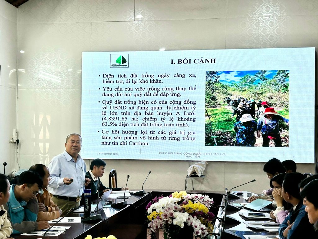 Trước những khó khăn và thách thức đó. Ngày 18/12/2023, UBND huyện A Lưới phối hợp với Trung tâm Nghiên cứu và Tư vấn Quản lý Tài nguyên (CORENARM) tổ chức Hội thảo “Kết nối nguồn lực hỗ trợ quản lý bền vững rừng cộng đồng” trong khuôn khổ dự án Đánh giá bản chất hiện tượng chuyển tiếp rừng ở Việt Nam (FTViet) do Quỹ khoa học Thụy Sĩ tài trợ cho Đại học Lausanne (UNIL), Đại học Nông Lâm Huế và Trung tâm CORENARM nhằm vào các mục đích như: Chia sẻ kinh nghiệm quản lý và phục hồi rừng cộng đồng (RCĐ) trong xu hướng hội nhập quốc tế hiện tại; Phát hiện các cơ hội và thách thức gắn với hoạt động bảo vệ và phục hồi rừng quy mô nhỏ; Định hướng kết nối các nguồn lực trong nước và quốc tế trong việc quản lý rừng bền vững, tạo động lực chủ rừng là các cộng đồng và hộ gia đình.